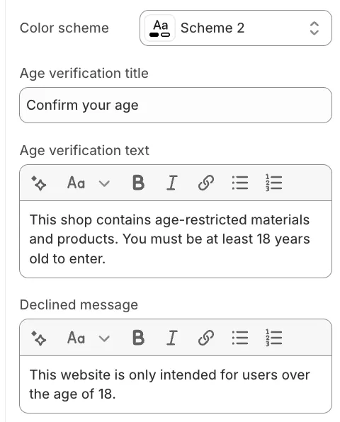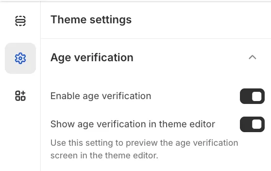 To activate the feature, check Enable age verification. Since the verification popup covers the entire screen, you must also check Show age verification in theme editor to visualize and customize your changes in real-time.
