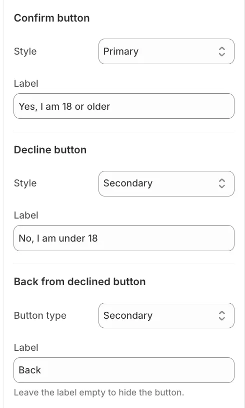 If your store sells age-restricted products, you can enable a mandatory pop-up that requires visitors to confirm their age before they can browse your content.