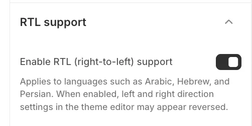 Note: In the Theme Editor, directional settings labeled "Left" and "Right" may appear visually reversed when you are previewing the store in an RTL language.