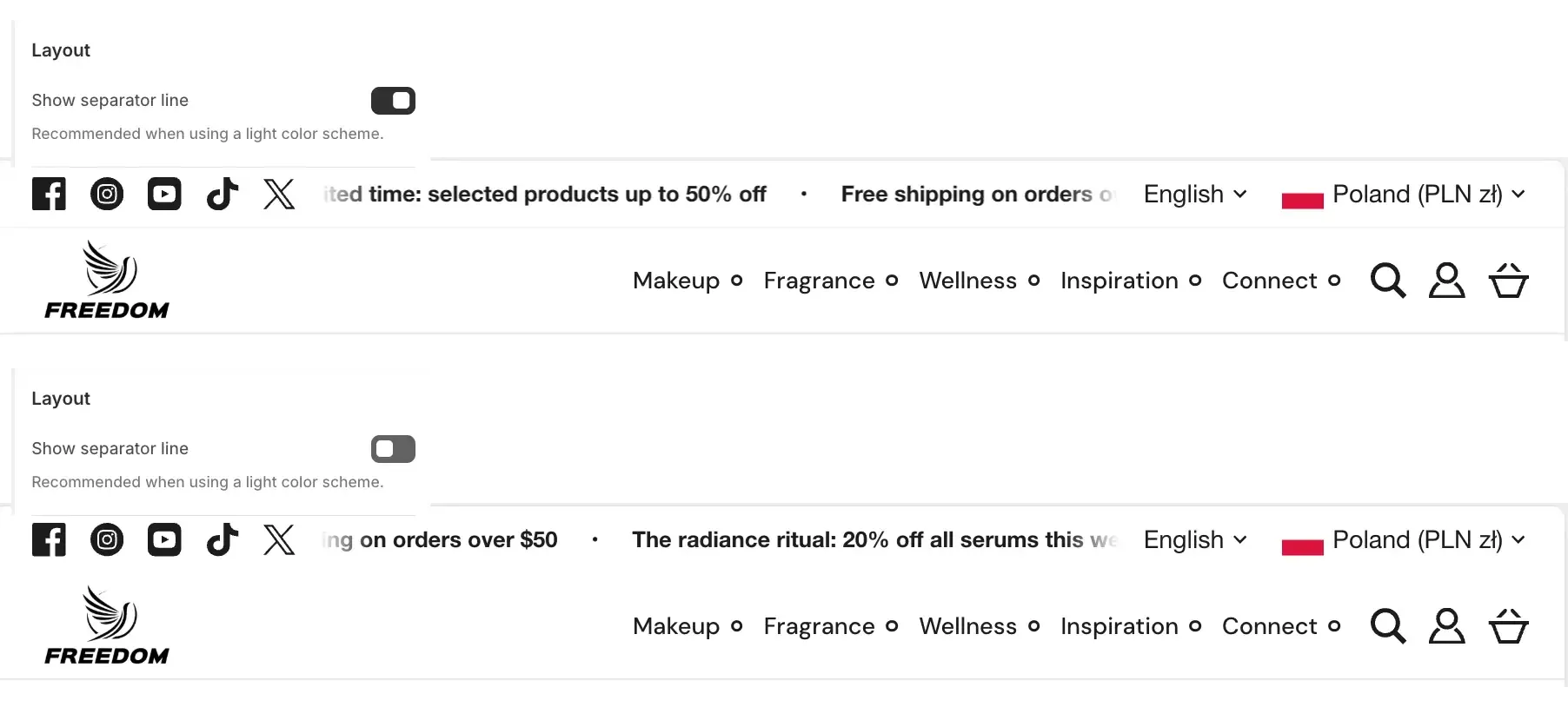 You can enable Show separator line to draw a thin border between the Top Bar and the Header. The separator line is typically recommended when the Top bar uses light colors.