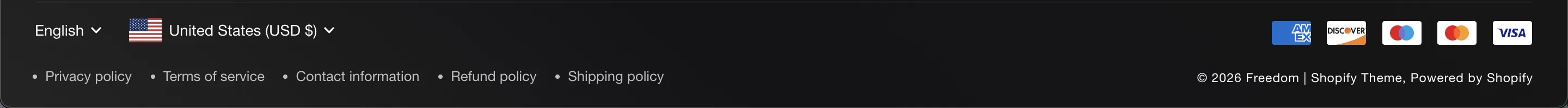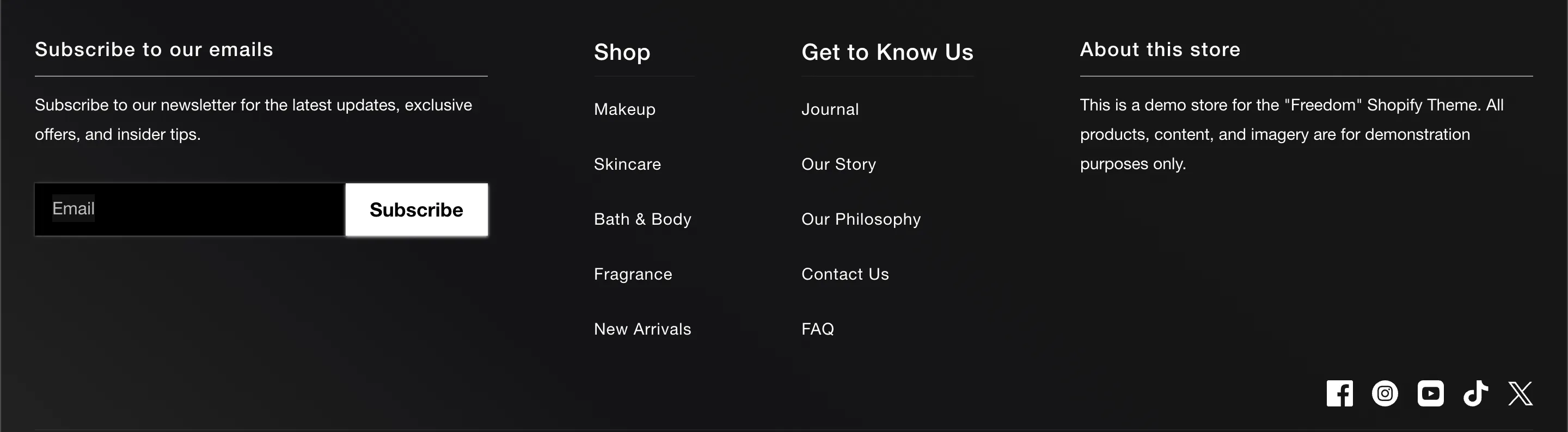 The footer is the anchor of your online store, providing essential navigation, trust signals, and legal information. Freedom splits the footer into two main areas: the content blocks (Upper) and the utility bar (Lower).