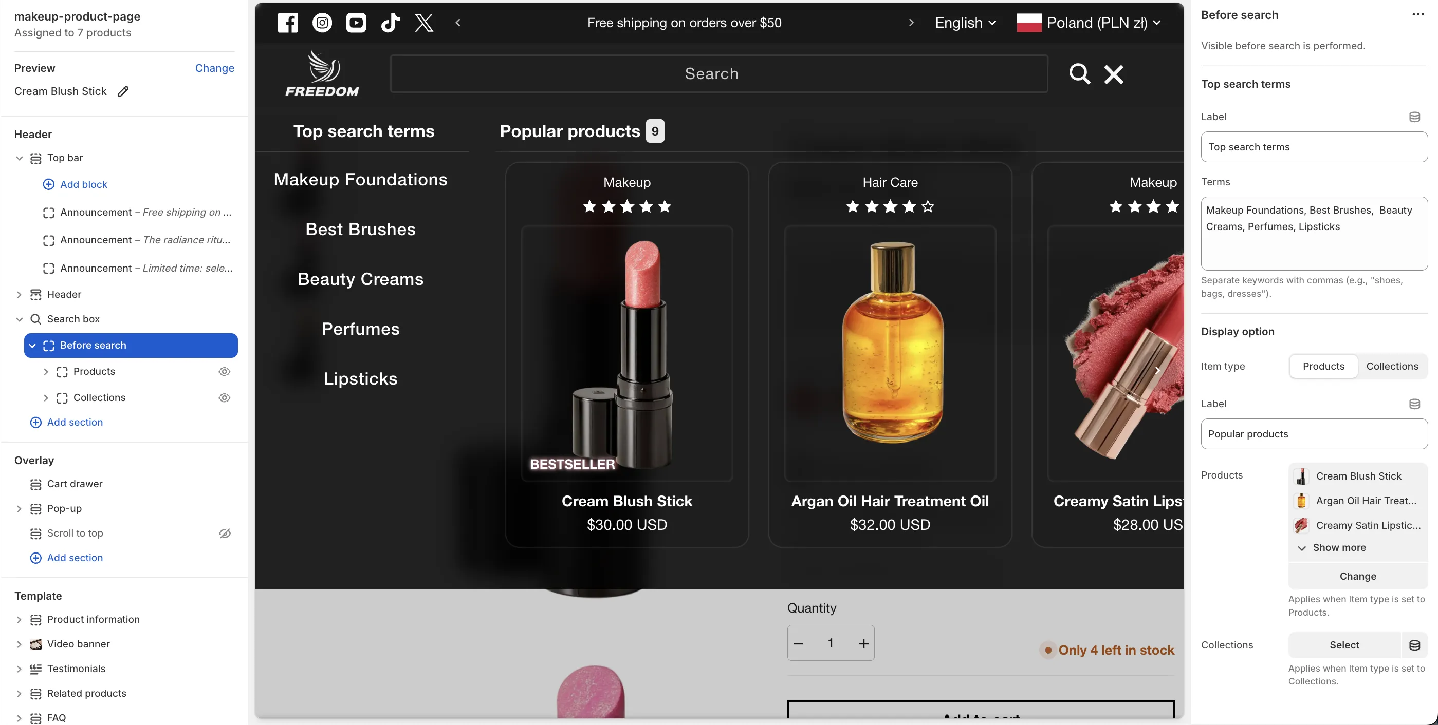 When the search overlay is opened but empty, you can display curated content to inspire visitors. This is managed through the Before search block located within the Search box section.