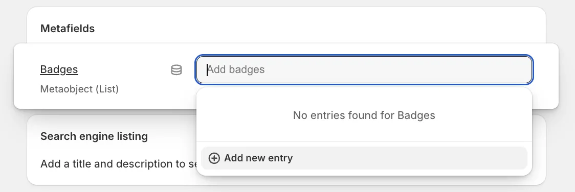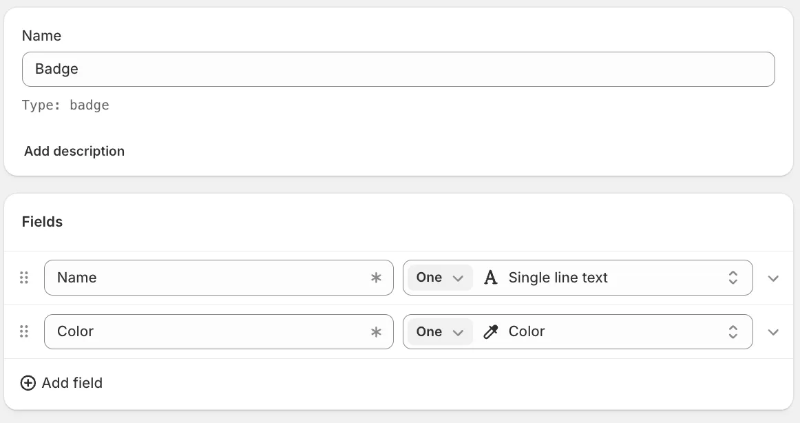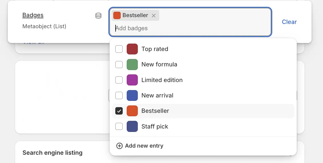For badges like "Staff Pick", "New Arrival", or "Bestseller", Freedom uses Shopify Metaobjects. This approach allows you to define a badge once (with its name and specific color) and reuse it across multiple products.