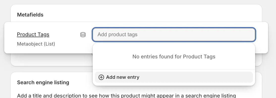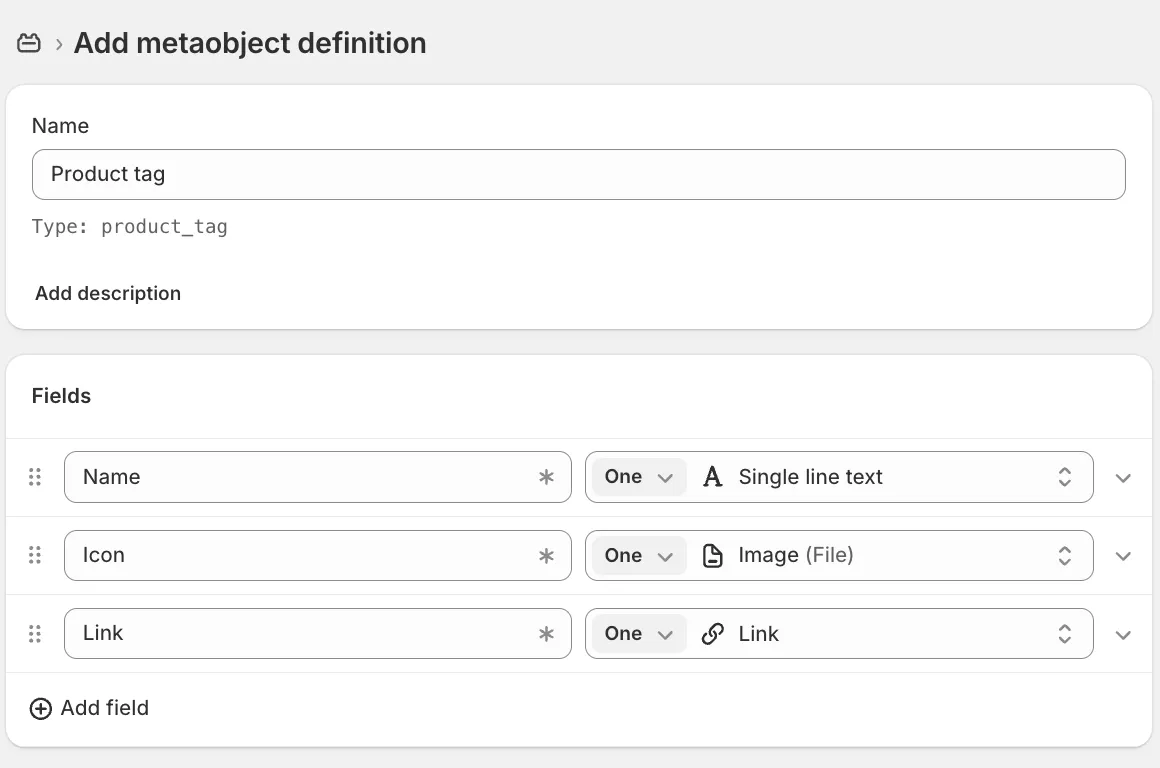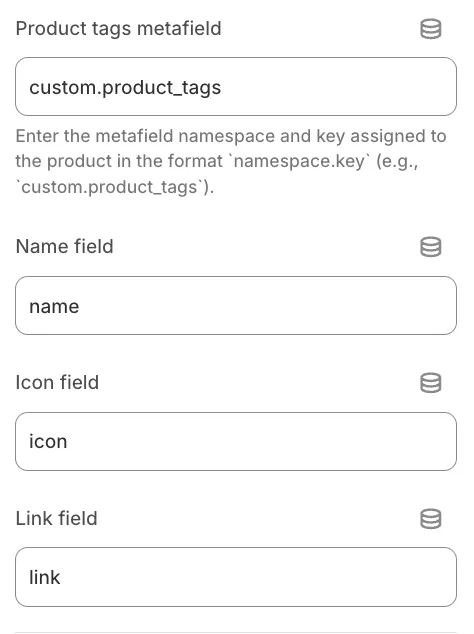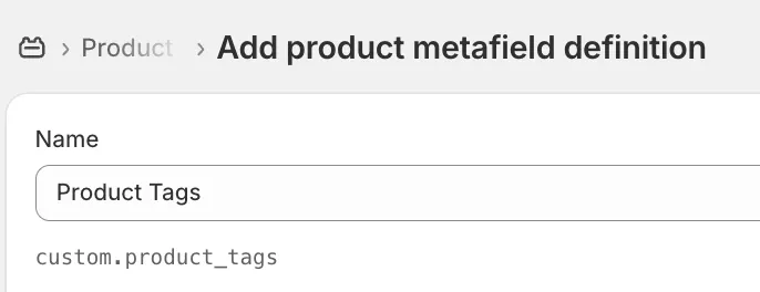 Metafield names can be customized in the Product tags block settings in the Theme Editor, but this tutorial uses the default configuration.
