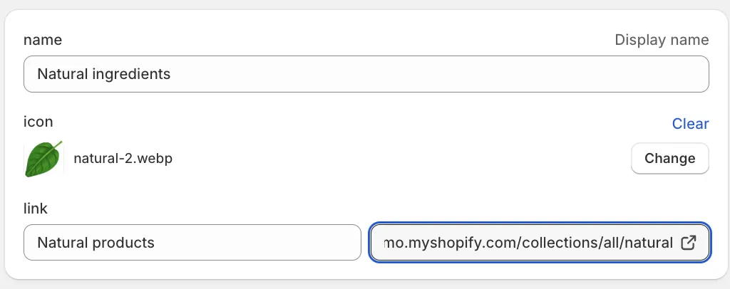 Fill in the Name (e.g., "Natural ingredients"), upload an Icon, and optionally add a Link.