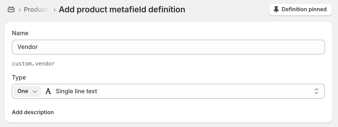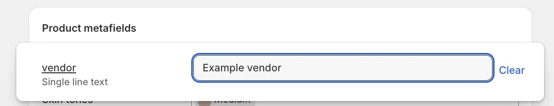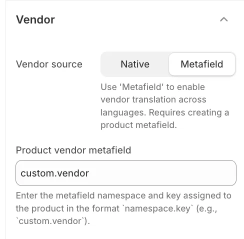 The Product vendor metafield should already be set tocustom.vendorby default. Verify that it matches the key you created in Step 1.