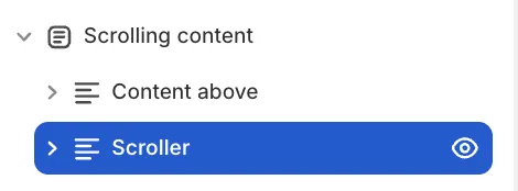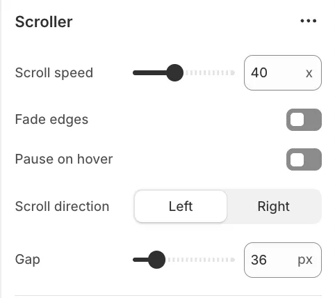 The Scroller block acts as the controller for the moving content. Click on it to adjust the following: