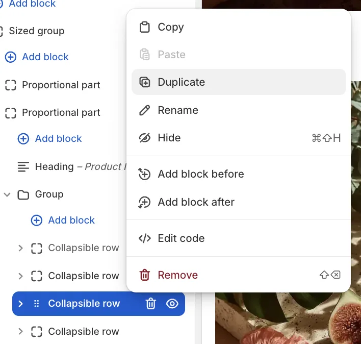 Adding Questions: The preset comes with pre-styled rows. To add a new question while maintaining the existing font sizes and settings, we recommend clicking on an existing block and selecting Duplicate, rather than adding a raw block from scratch.