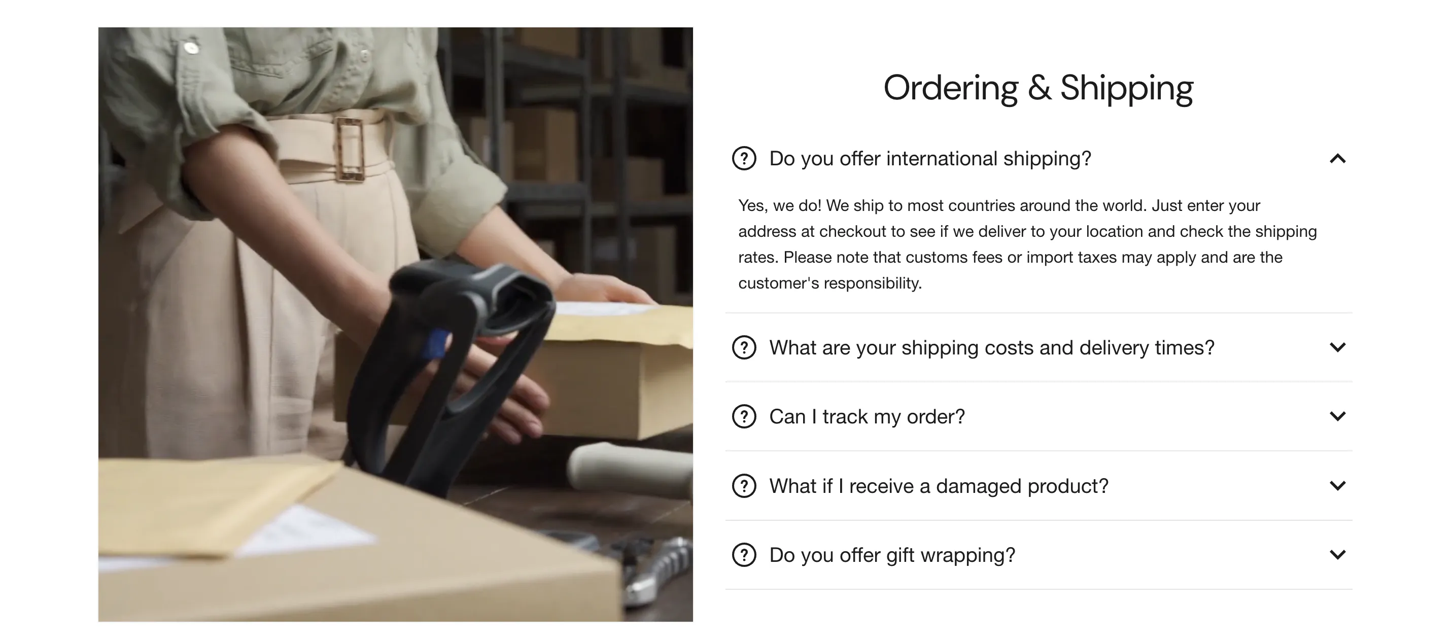 Organize common inquiries in a clean, expandable format using one of three distinct presets: FAQ, FAQ with image, or FAQ with video.