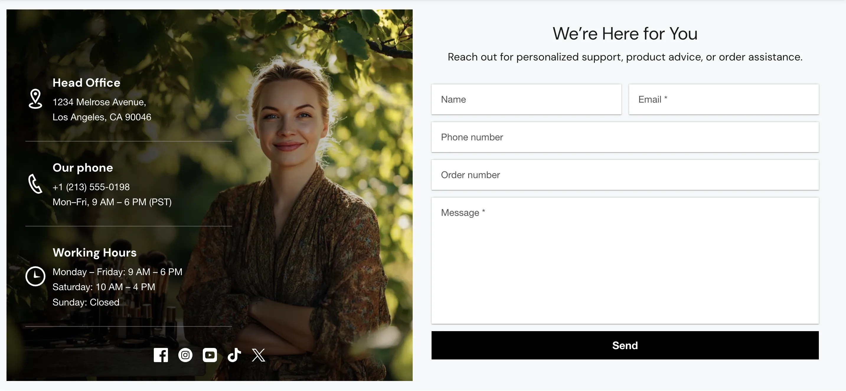 The Contact Form allows customers to send messages directly to the customer email address configured in your Shopify Admin.